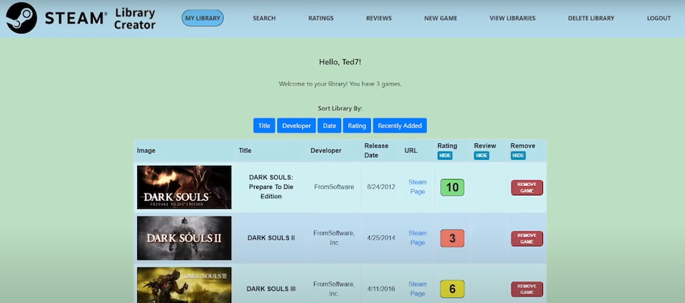 Users can create an account with a password and sign in to use it. The website’s features include: searching for games in the database, adding and removing games from one’s library, rating games from 1-10, writing reviews, deleting one’s entire library, adding a new game to the database, and viewing other users' libraries.