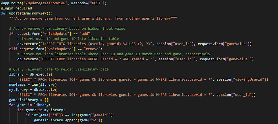Every page employs one or more Flask route, using GET and POST methods. One of the trickier examples of this was the "/updategamefromview" route. This route concerns the page that allows people to view other users' libraries.