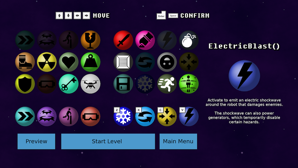 For the cores, much effort was put into the idea of making sure the cores were as balanced as possible, as each took up an equal 1 of 8 slots. For example, the core LockBreaker() can effectively let the player skip the entire level if they wish, which sounds extremely unbalanced, but the tradeoff would be that the player would take a large hit to their overall level score if they did so, having likely skipped over all the keys, enemies, and collectibles.