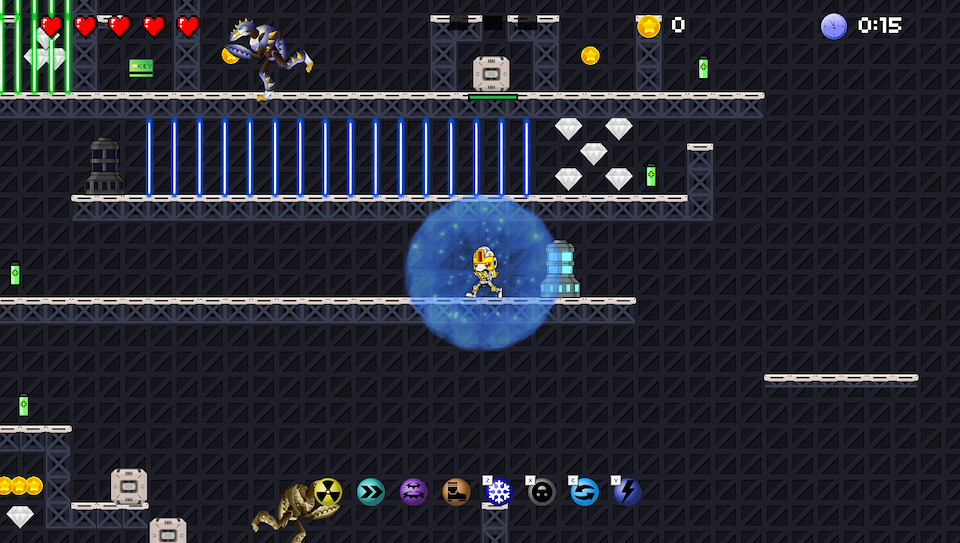 Finally, the level design was a large undertaking, as it had to be possible with any combination of the 24 cores. As a result, the three keys which are required to progress (without LockBreaker) could not be gated behind small areas, acid, lasers, spikes, etc. To combat this, the keys were simply guarded by enemies, so that even if the player had no cores, they could still defeat or avoid the enemies to reach them.