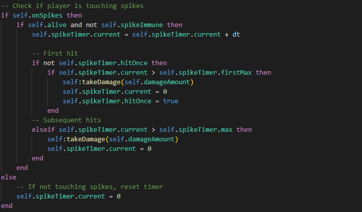 A snippet of the system in which the player takes damage on a timer-based system, as opposed to only on the frame of initial contact