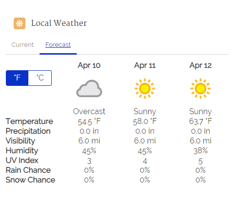 The weather component for each property, with options to view the current weather or a 3-day forecast, and options for Fahrenheit and Celsius.