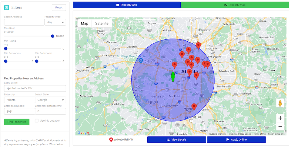 • A public-facing property explorer to view all currently available properties, with two viewing options: a tiled grid, or a Google map. These properties could be filtered through a variety of parameters, including limiting to properties a chosen distance from either an inputted address or the user’s current location.