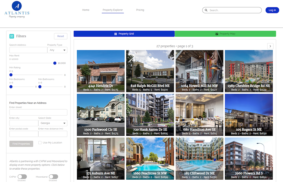 The grid option for the Property Explorer, a public-facing and highly filterable list of available properties.
